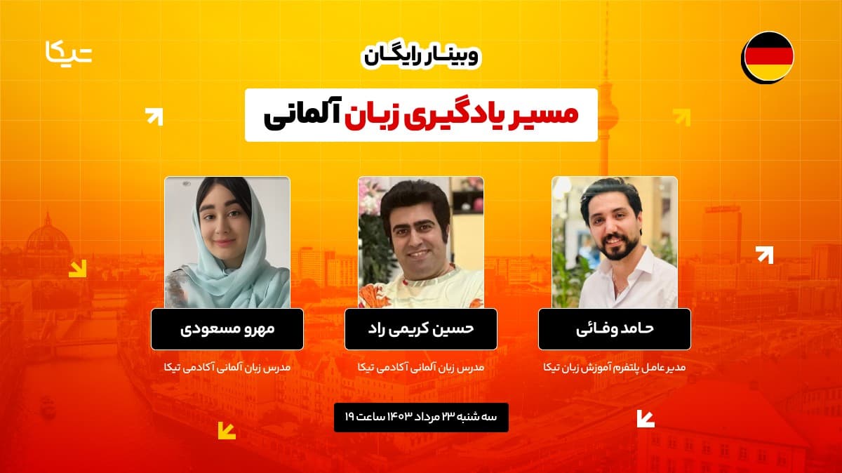 سلام به همه دوستان علاقه مند به یادگیری، به ویژه یادگیری یک زبان! اگر تجربه شروع یادگیری زبان آلمانی را داشته باشید، حتما بنظرتون زبان بسیار سختی است! موافقم باهاتون، حالا راه حل چیه؟ تیکا سعی داره تا مسیر یادگیری زبان آلمانی رو براتون ساده تر کنه. ما از بهترین اساتید این زبان در این مسیر کمک می گیریم. امید داریم که این تلاش های ما مسیر یادگیری یک زبان جدید را برای شما شیرین تر و روشن تر کند. با ما همراه باشید. اینبار برای زبان آموزان و علاقه مندان زبان آلمانی خبر های خوبی داریم! آیا به زبان آلمانی علاقه دارید؟ آیا در حال یادگیری زبان آلمانی هستید؟ آیا در مورد زبان آلمانی اطلاعات کافی ندارید؟ اگر در ابتدای مسیر یادگیری زبان آلمانی هستید یا به دنبال یک برنامه ریزی دقیق و اصولی برای مسلط شدن به این زبان هستید، این وبینار رایگان ویژه شماست!